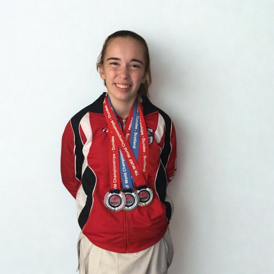 Competing in both kata and Kumite. She has represented England at six World Championships and has achieved a tally of Gold, Silver and Bronze medals in both Individual and team events.